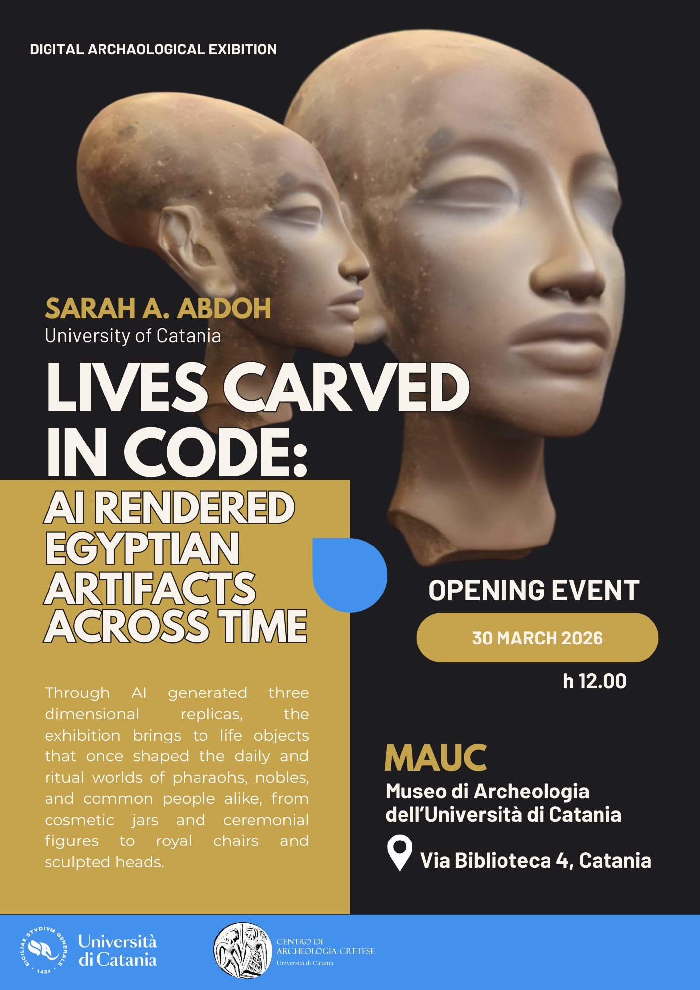 La mostra, organizzata da Sarah Abdoh, Professore associato presso il "Sculpture, Architectural Formation and Restoration Department", Faculty of Applied Arts (BU, Egitto), esplora l’intersezione tra il patrimonio dell’antico Egitto e la creazione digitale contemporanea. Attraverso repliche 3D generate con l’intelligenza artificiale, riporta in vita oggetti che un tempo facevano parte del mondo quotidiano e rituale di faraoni, nobili e persone comuni. Ogni manufatto, ricostruito nello spazio digitale, diventa memoria del passato e al tempo stesso interroga la natura dell’autenticità, della memoria e della materialità, invitando a riflettere su come la storia possa essere conservata, interpretata e reimmaginata.